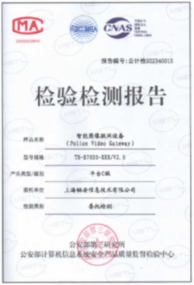 智能图像联网管理平台通过GB 35114(平台C级)测试,取得检测报告。