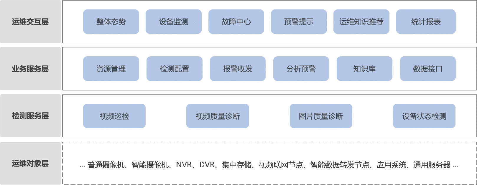运维平台软件:汇聚、存储专用检测设备推送的全量运维数据,通过各式图表综合显示运维对象的多维态势,监测视频图像设备/系统的运行状态,实时推送直接检测发现的故障事件或对运维数据分析产生的预警消息,通过运维知识库针对故障消息关联推荐解决方案。